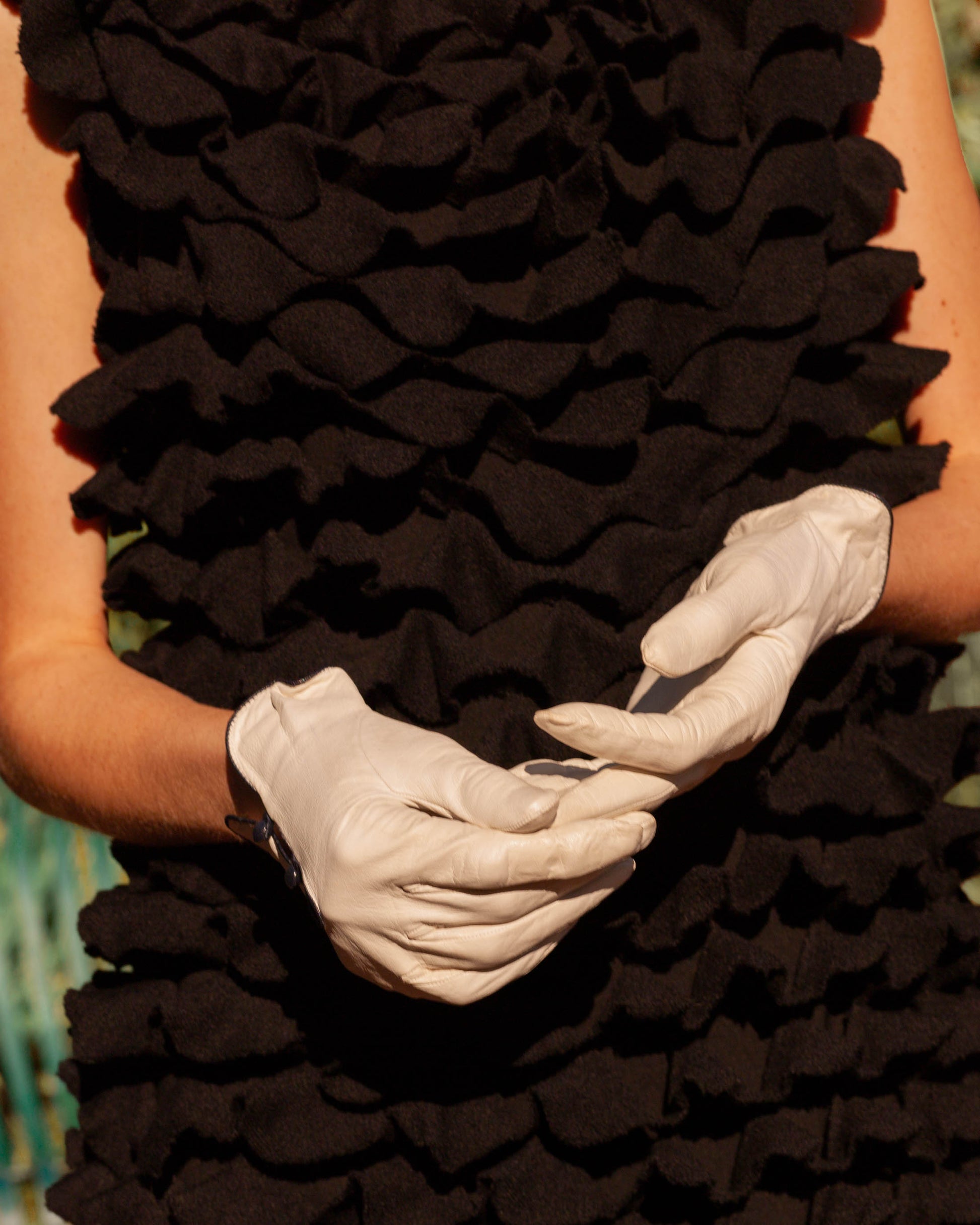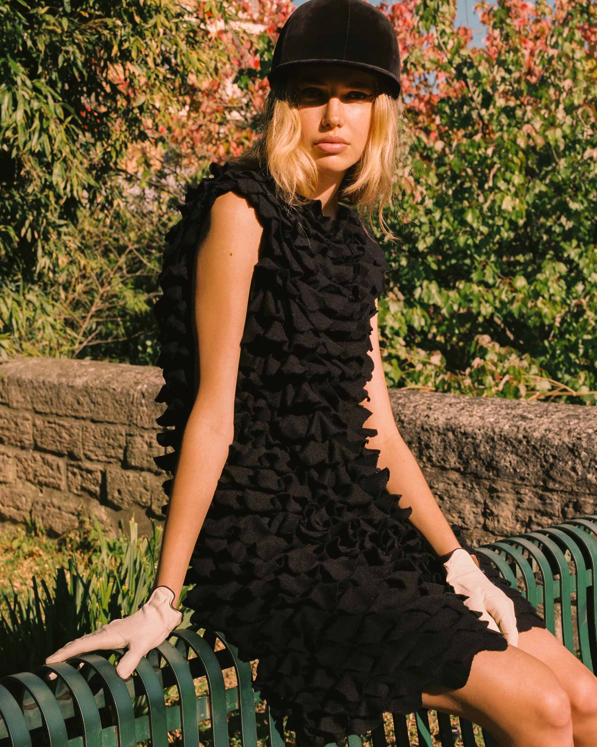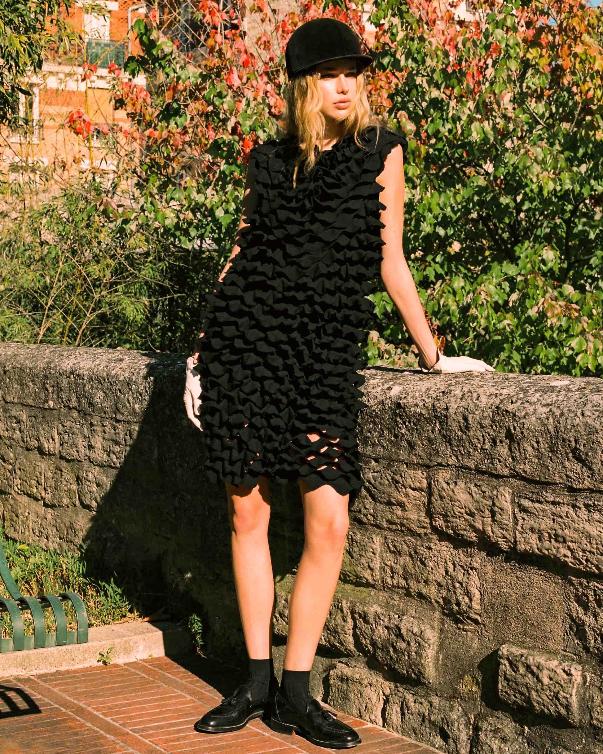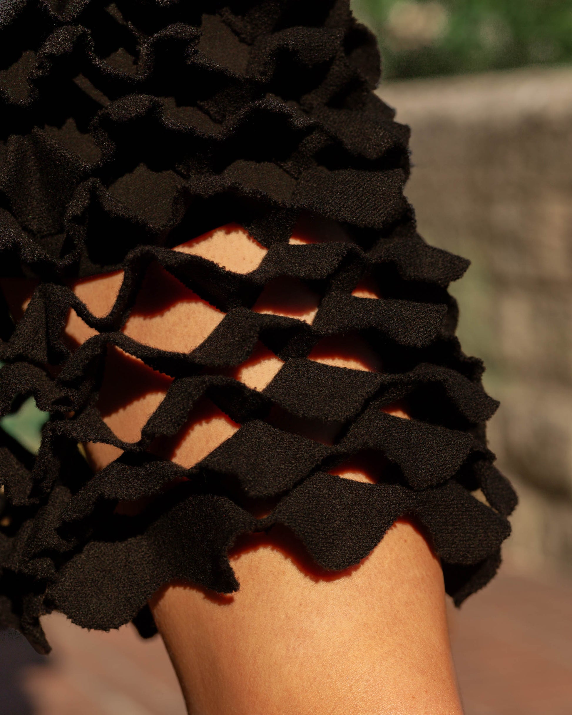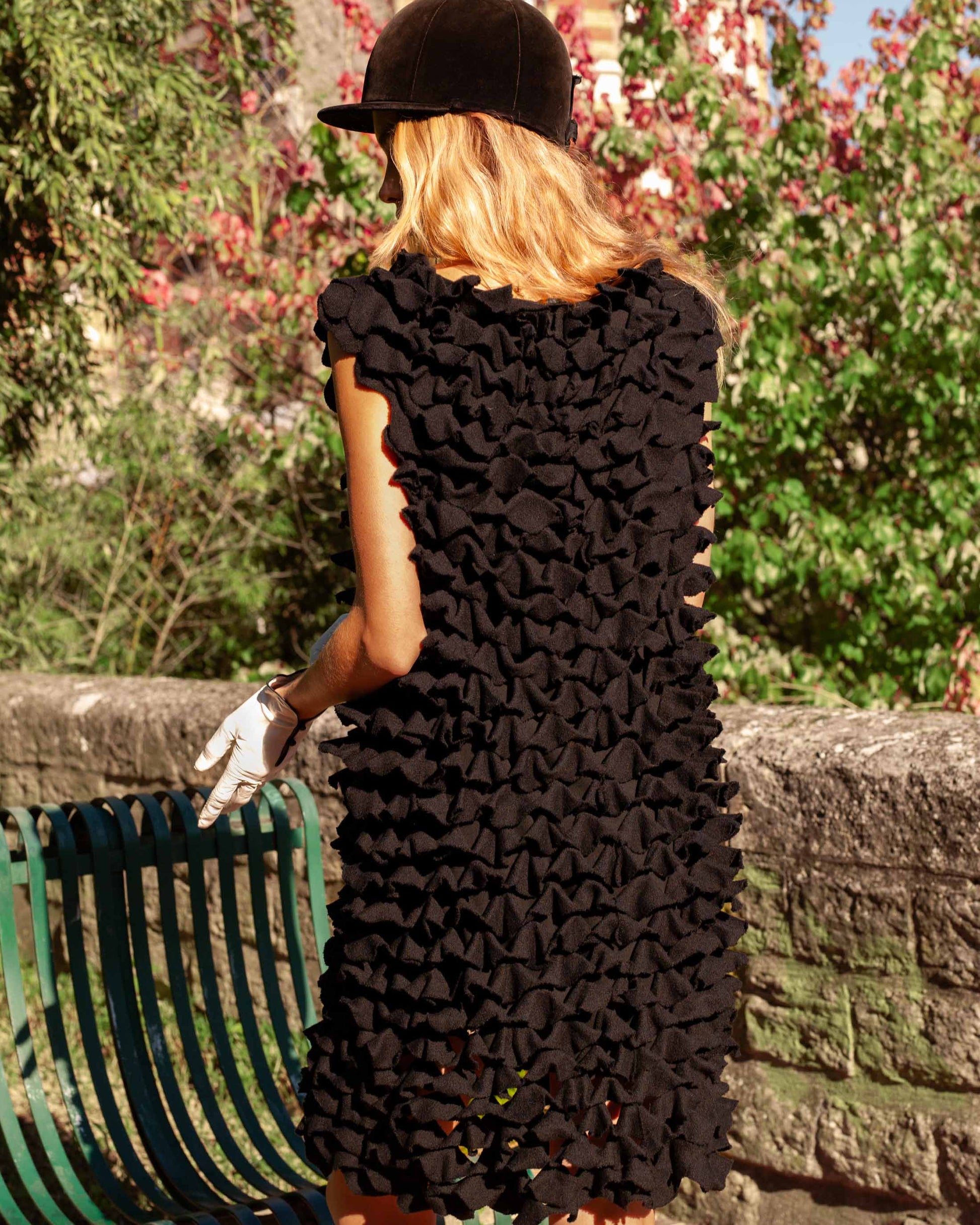 Rare sleeveless dress with sheer ruffles, the dress is lined. Size: 38 IT 34/36 fr. Circa: 2000. Color: black. Material: Wool. Country of manufacture: Italy. Flat measurements: Length: 90 cm. Condition : excellent.