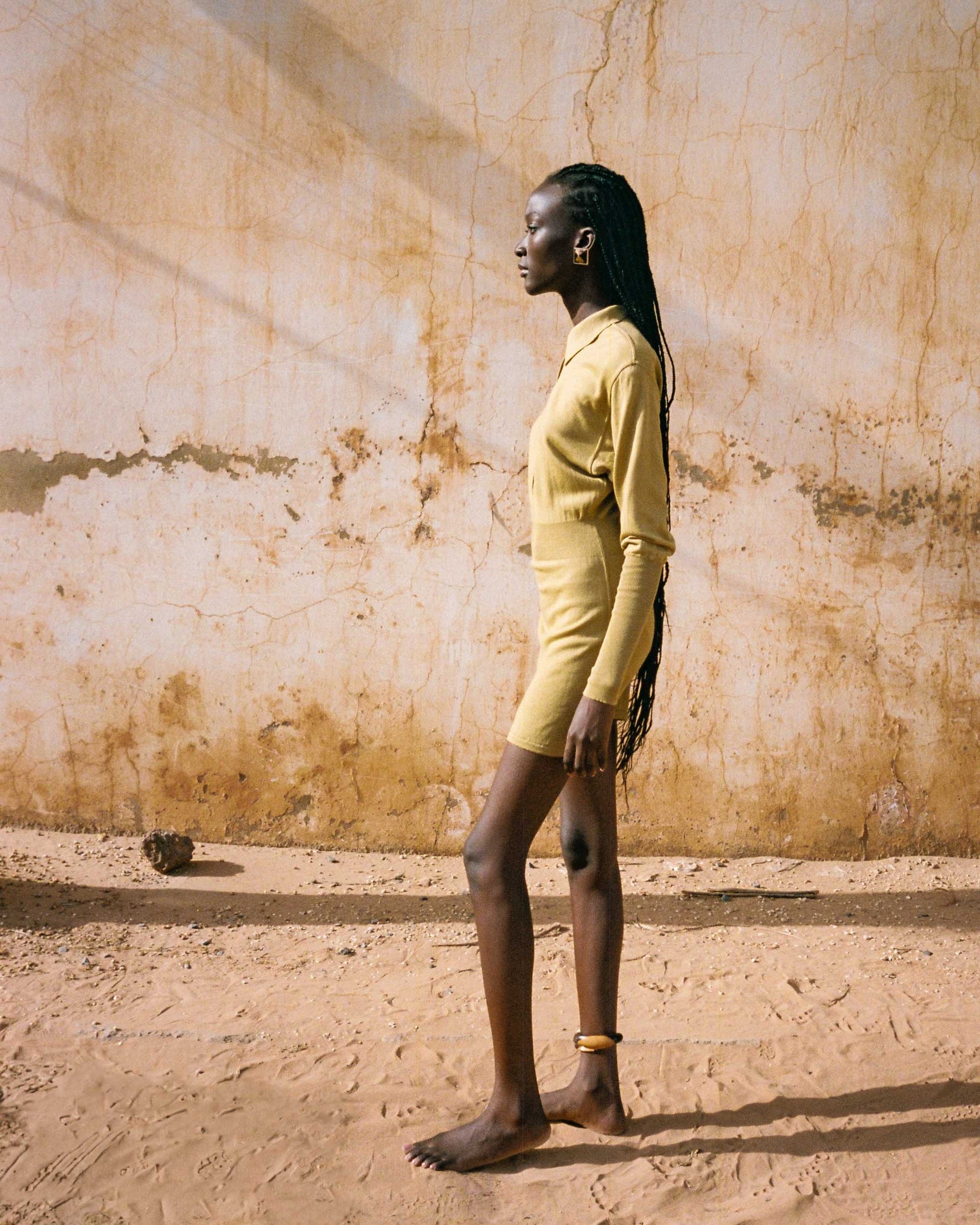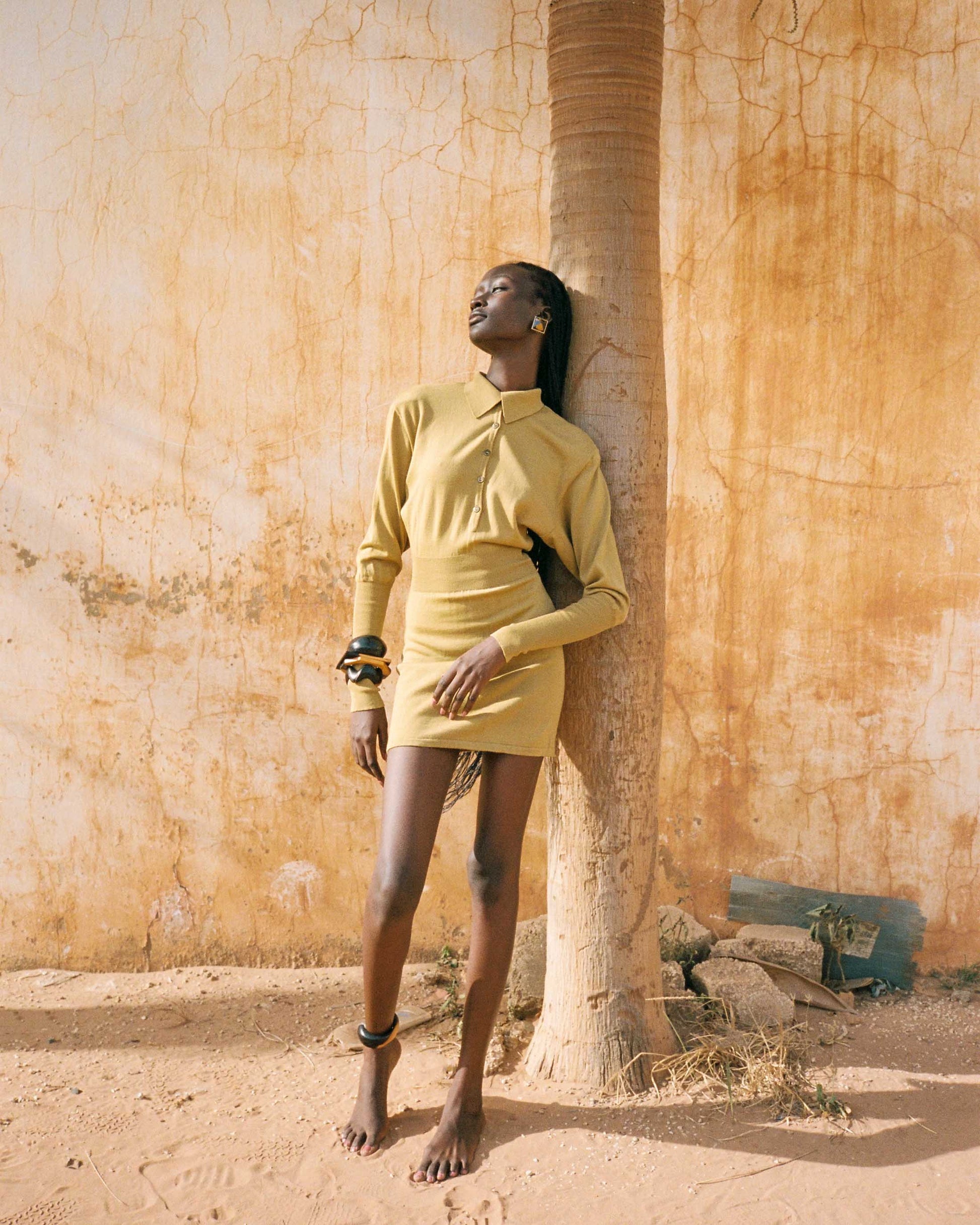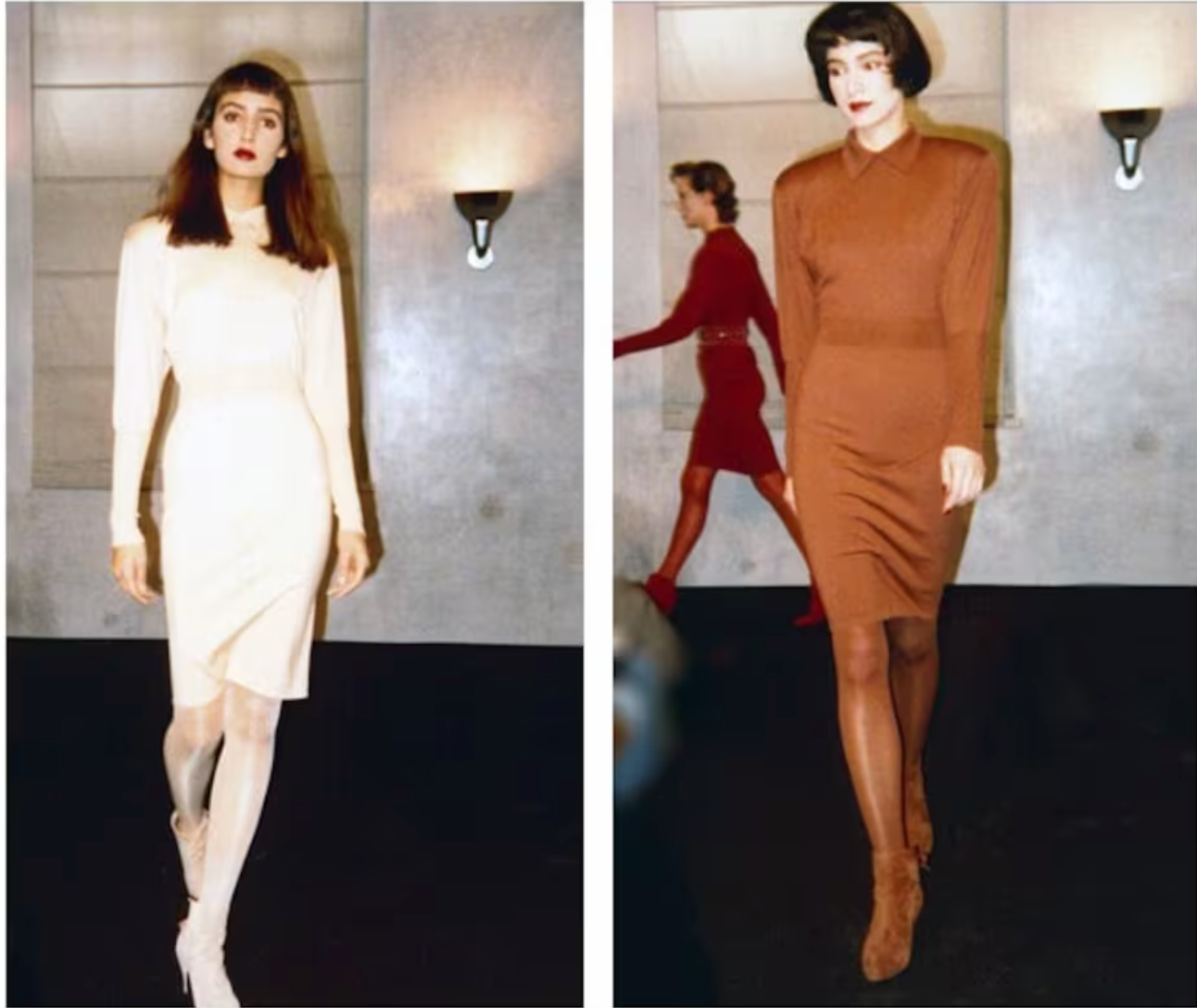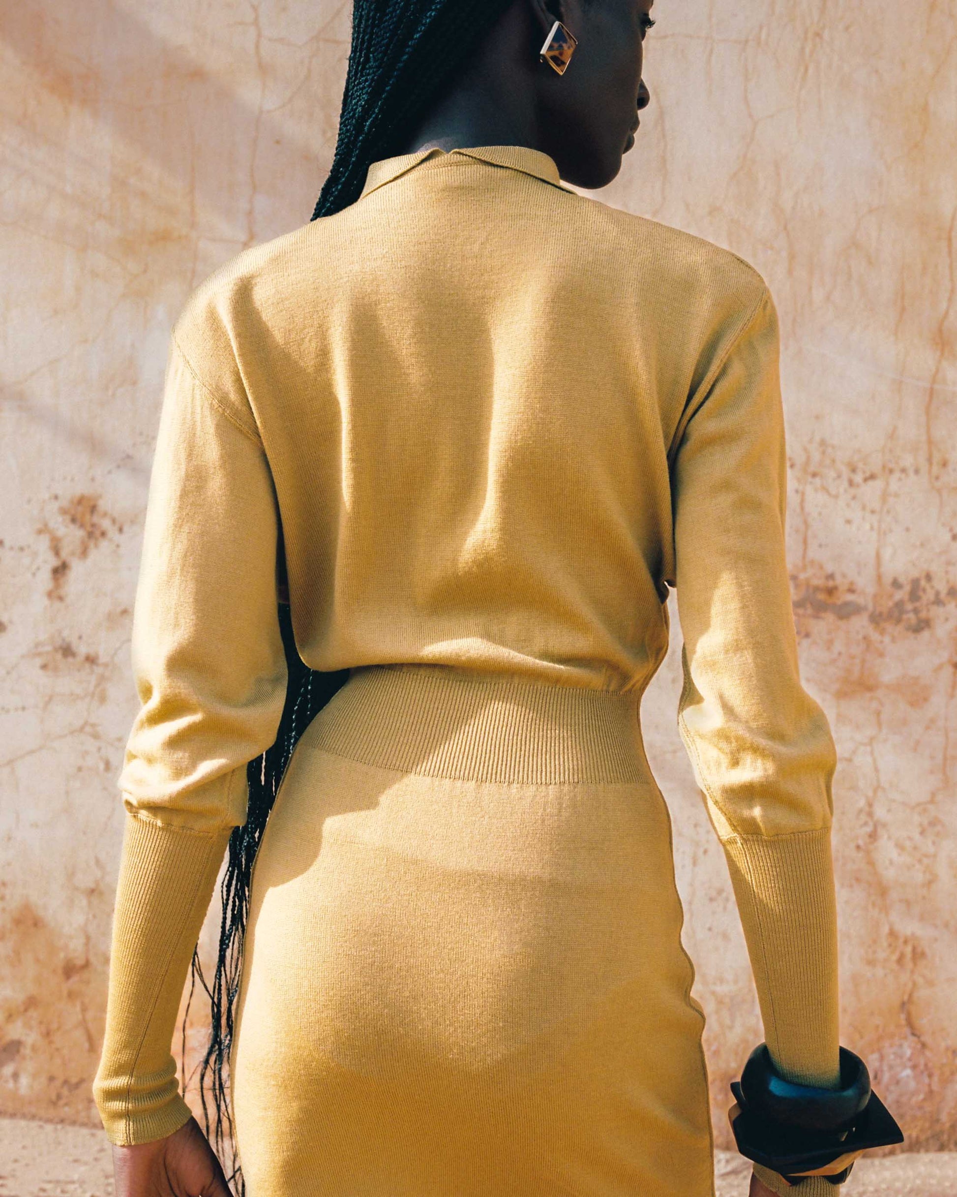 Knit dress with long sleeves, polo collar adorned with buttonholes. Size: 38 FR. Circa: FW 1985/1986. Color: mustard. Material: virgin wool. Country of manufacture: France. Flat measurements: Length: 77 cm, Waist: 24 cm, Sleeve Length: 65 cm. Condition: excellent.