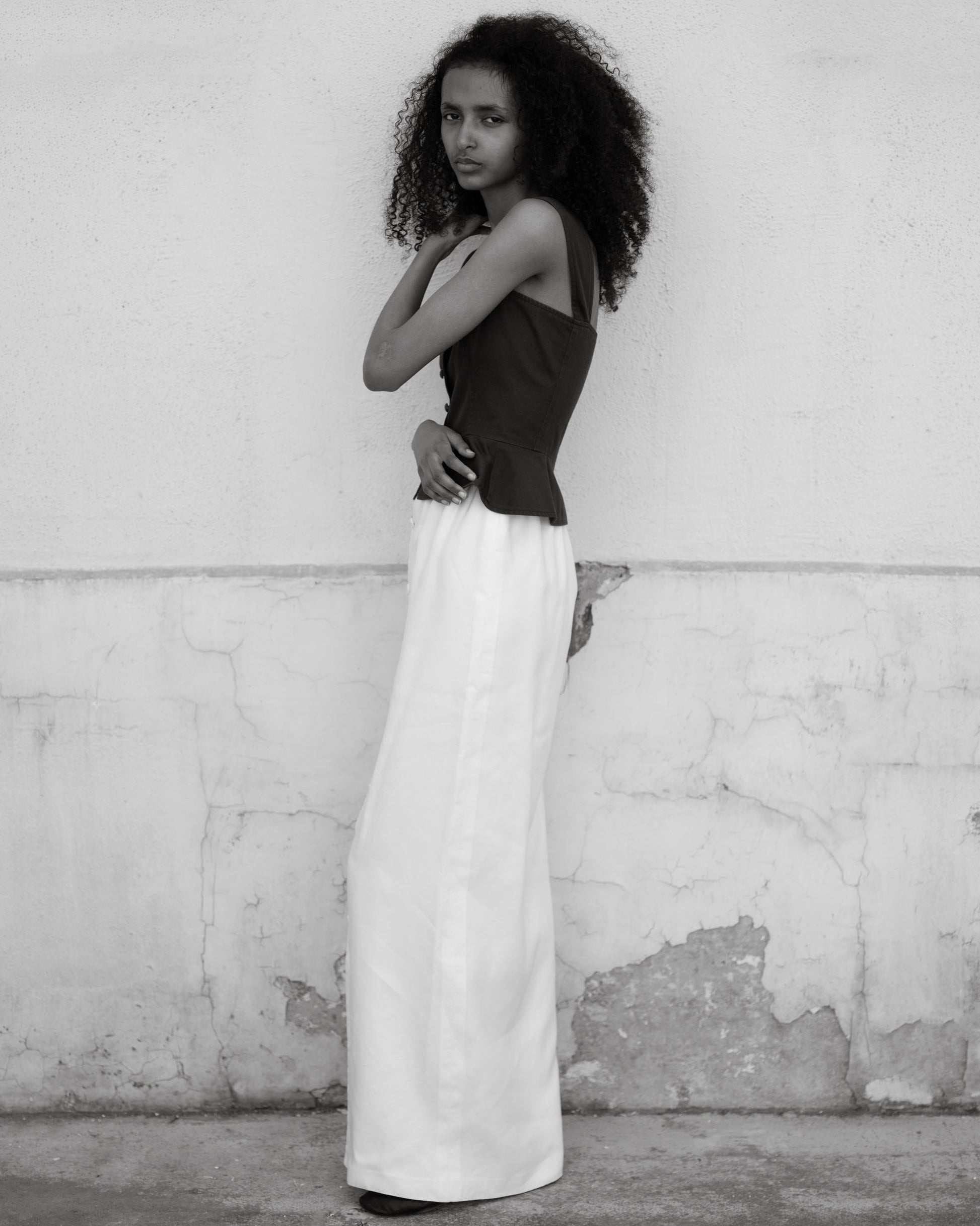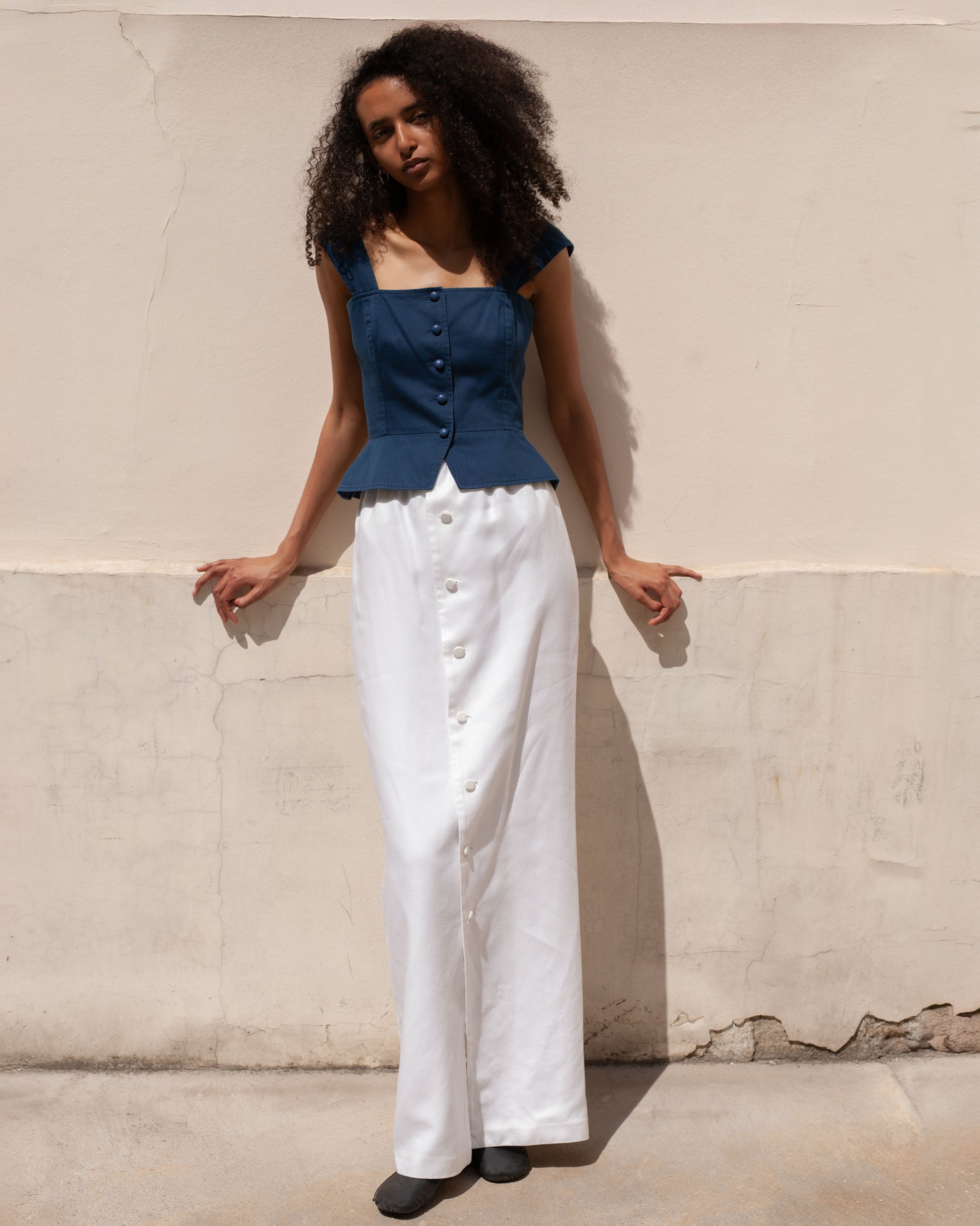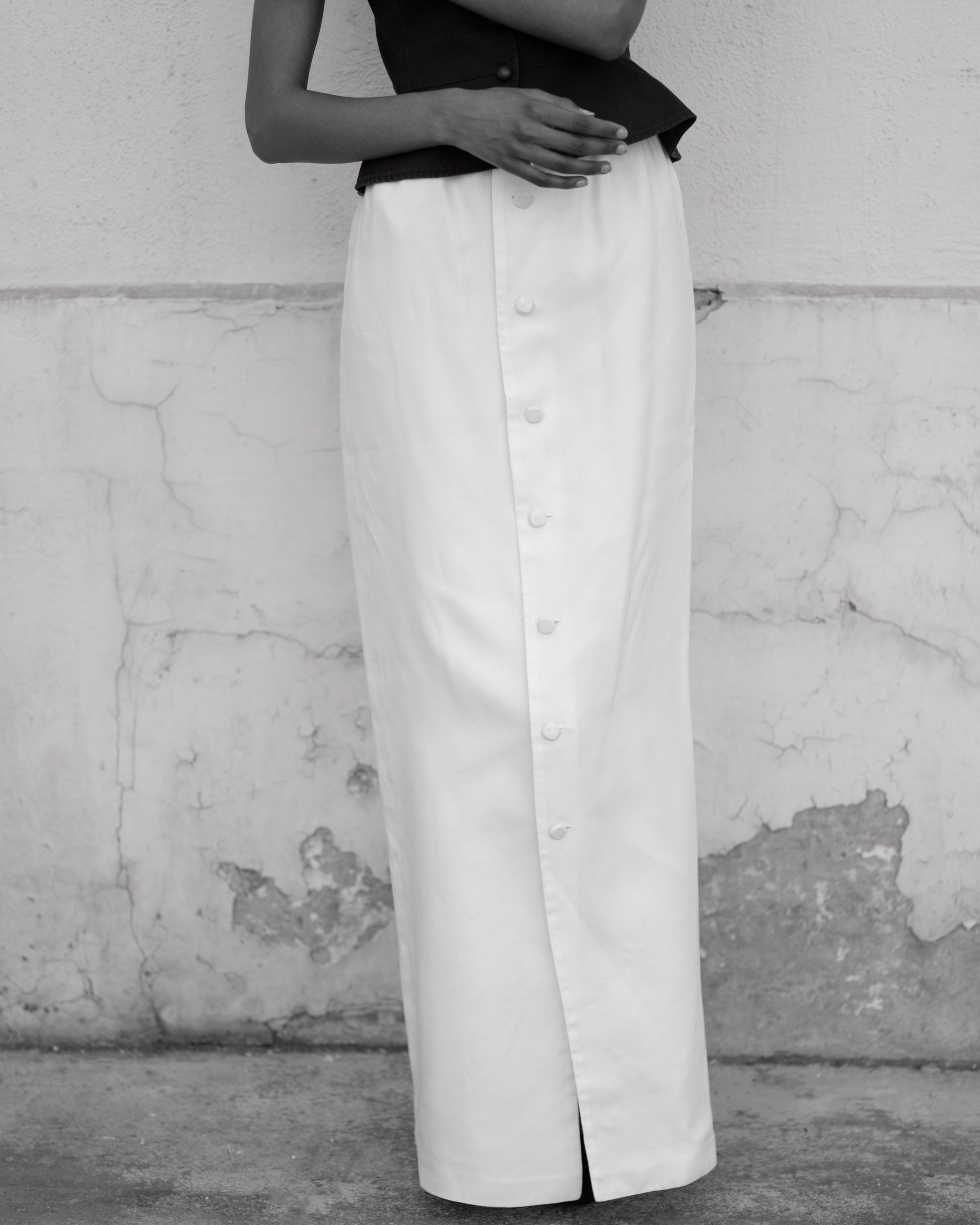 Extra-long high-waisted skirt with a straight cut, buttoned down the front. Circa: 1980s. Size: FR 36. Color: White. Material: Linen. Made in: France. Condition: Excellent.