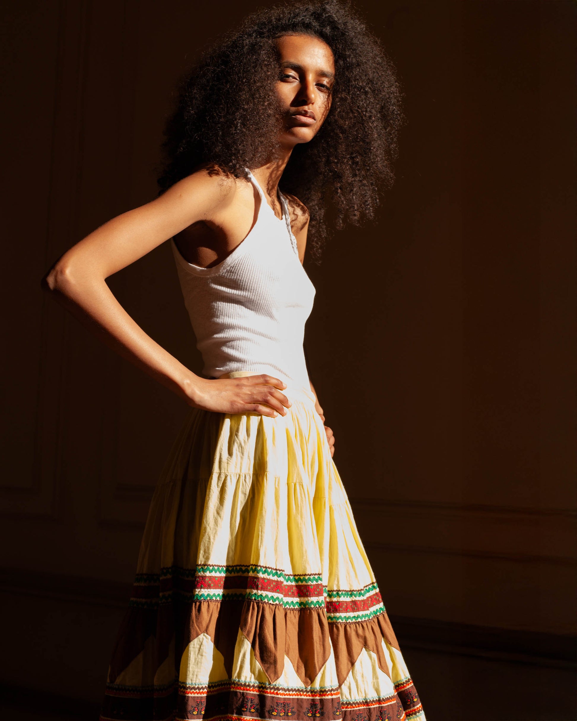 Rare Hémisphères Skirt. A high-waisted skirt with a generous, flowing cut, adorned with delicate embroidery. Size: FR 36. Circa: 1980s. Colors: Yellow, green, brown. Material: Cotton. Made in: USA. Condition: Excellent.