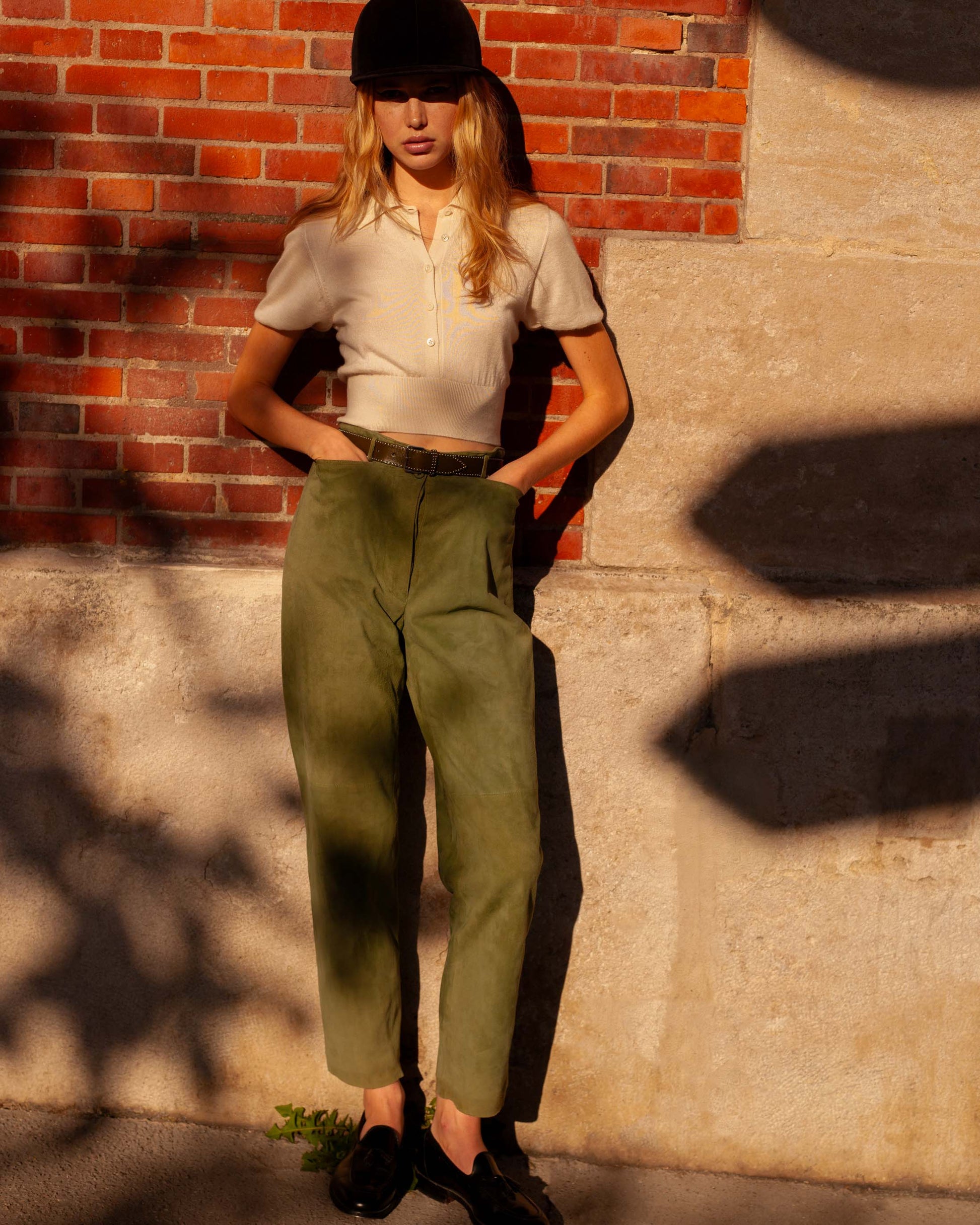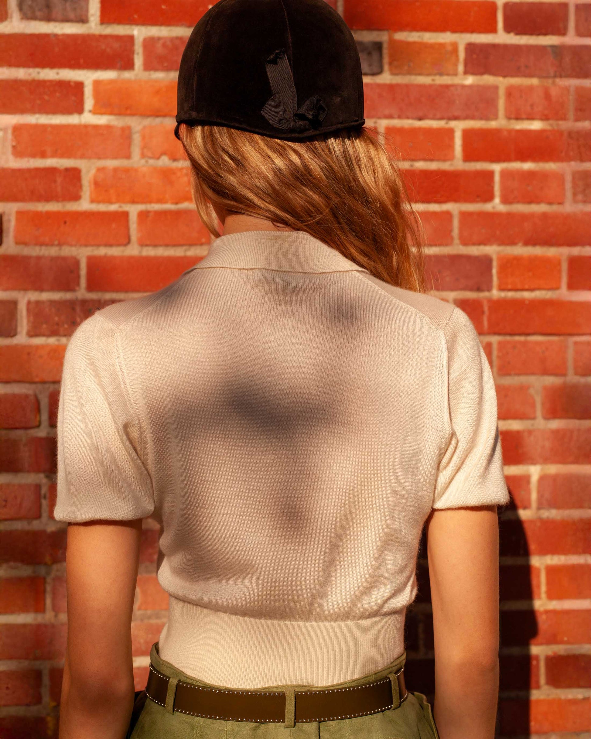 Short cashmere and silk sweater, polo collar with button placket on the front. Short, slightly gathered sleeves.Size: 36 fr / 40 it. Circa: 2000’s. Color: Ecru. Material: Cashmere, silk. Country of manufacture: Italy. Flat measurements: Length: Sleeve length: 45 cm
