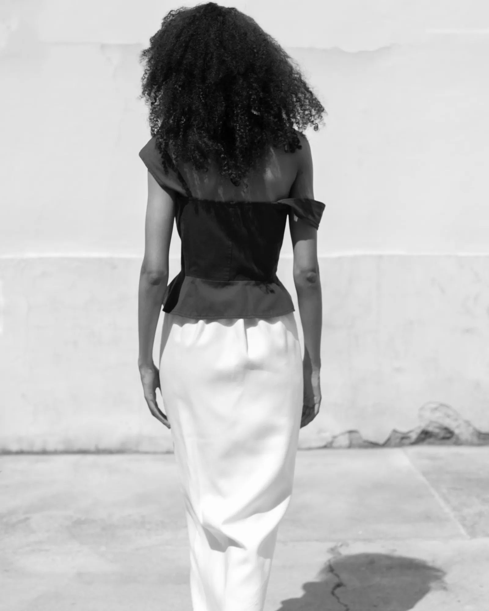 Jupe extra longue à taille haute, coupe droite, boutonnée sur le devant. Circa : 1980’s. Taille : 36 fr. Couleur : Blanc. Matière : Lin. Pays de fabrication : France. Condition : Excellent.